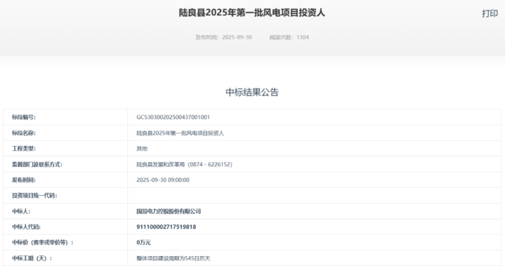 9月30日,云南省公共资源交易信息网发布《陆良县2025年第一批风电项目投资人中标结果公告》。
